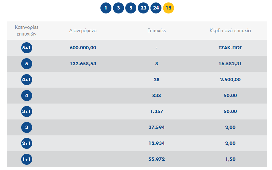 Οι αριθμοί που κληρώθηκαν είναι: 1,3,5,23,24 και τζόκερ ο αριθμός 15.