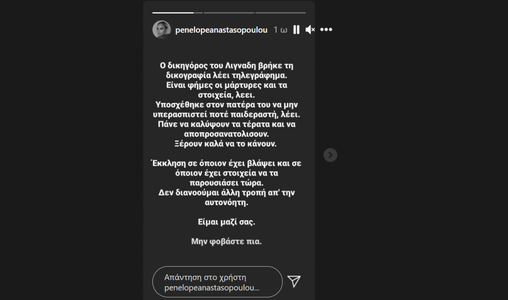 «Ο δικηγόρος του Λιγνάδη βρήκε λέει τη δικογραφία, τηλεγράφημα. Είναι φήμες οι μάρτυρες και τα στοιχεία λέει. Υποσχέθηκε στον πατέρα του να μην υπερασπιστεί ποτέ παιδεραστή, λέει. Πάνε να καλύψουν τα τέρατα και να αποπροσανατολίσουν… Έκκληση σε όποιον έχει βλάψει και σε όποιον έχει στοιχεία να τα παρουσιάσει τώρα. Δε διανοούμαι άλλη τροπή από την αυτονόητη. Είμαι μαζί σας. Μη φοβάστε πια», έγραψε χαρακτηριστικά η ηθοποιός.