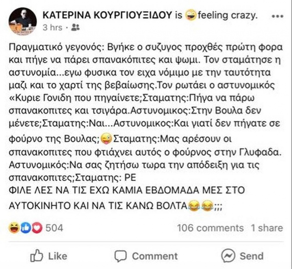 O Σταμάτης Γονίδης ο οποίος άφησε για λίγο την καραντίνα και βγήκε με το αμάξι για να πάει να αγοράσει κάτι που ήθελε πολύ με τη σχετική βεβαίωση.