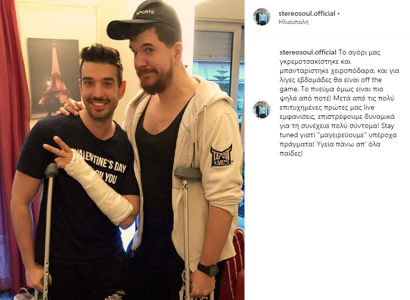 «Το αγόρι μας γκρεμοτσακίστηκε και μπανταρίστηκε χειροπόδαρα, και για λίγες εβδομάδες θα είναι off the game. Το πνεύμα όμως είναι πιο ψηλά από ποτέ! Μετά από τις πολύ επιτυχημένες πρώτες μας live εμφανίσεις, επιστρέφουμε δυναμικά για τη συνέχεια πολύ σύντομα! Stay tuned γιατί "μαγειρεύουμε" υπέροχα πράγματα! Υγεία πάνω απ' όλα παίδες!», έγραψε σε ανακοίνωσή του το συγκρότημα Stereo Soul.