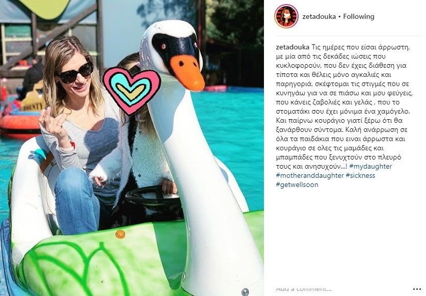 Τις τελευταίες ημέρες, η τριών ετών κορούλα της Ζέτας Δούκα είναι άρρωστη καθώς τη ταλαιπωρεί μία ίωση.