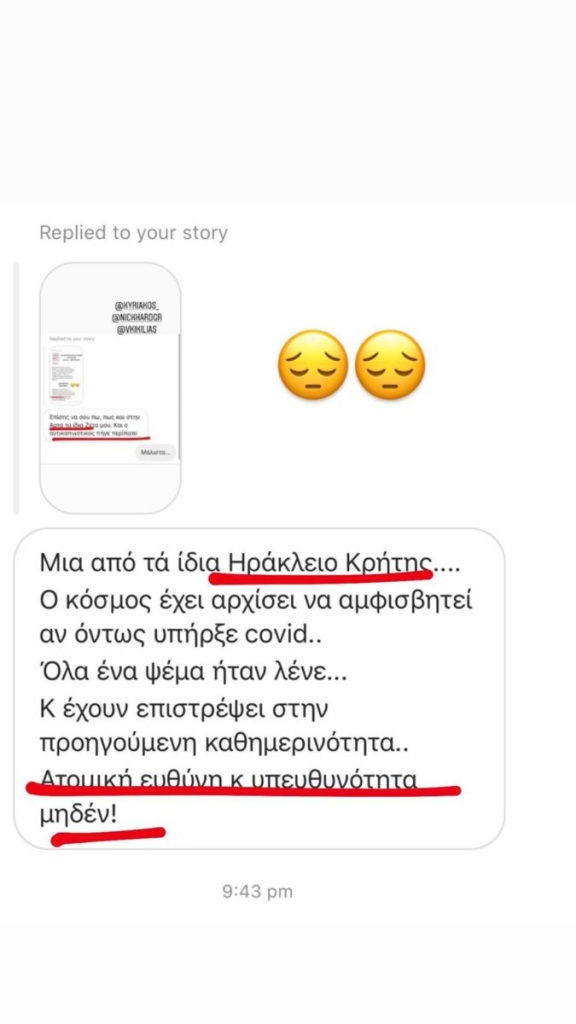 Η ηθοποιός με τη βοήθεια των followers της απ΄όλη την Ελλάδα συγκέντρωσε μαρτυρίες για περιστατικά συνωστισμού και έκανε κοινοποίηση τα storieς, τόσο τον πρωθυπουργό Κυριάκο Μητσοτάκη, όσο και τον υφυπουργό πολιτικής προστασίας και διαχείρισης κρίσεων Νίκο Χαρδαλιά.
