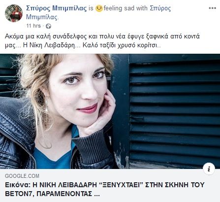 .Την είδηση του θανάτου της έκανε γνωστή ο Σπύρος Μπιμπίλας με ανάρτησή του στο Facebook: