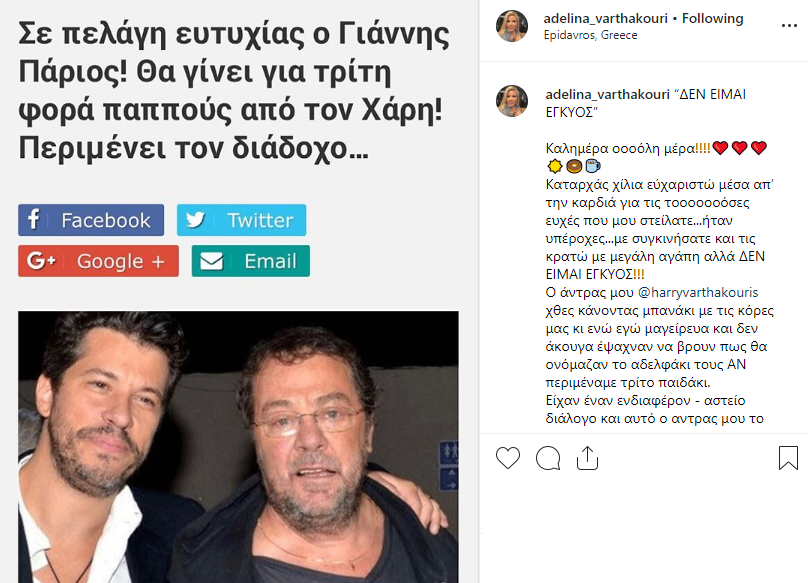 Οι φήμες ήθελαν τη σύζυγό του Χάρη Βαρθακούρη, Αντελίνα, να είναι για τρίτη φορά έγκυος. Η ίδια διέψευσε την είδηση με ανάρτησή της στο Instagram.