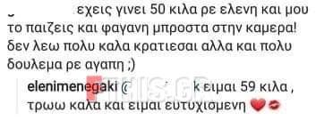 «Έχεις γίνει 50 κιλά ρε Ελένη και μου το παίζεις και φαγανή μπροστά στην κάμερα. Δεν λέω, πολύ καλά κρατιέσαι αλλά και πολύ δούλεμα ρε αγάπη», σχολίασε ένας Follower.