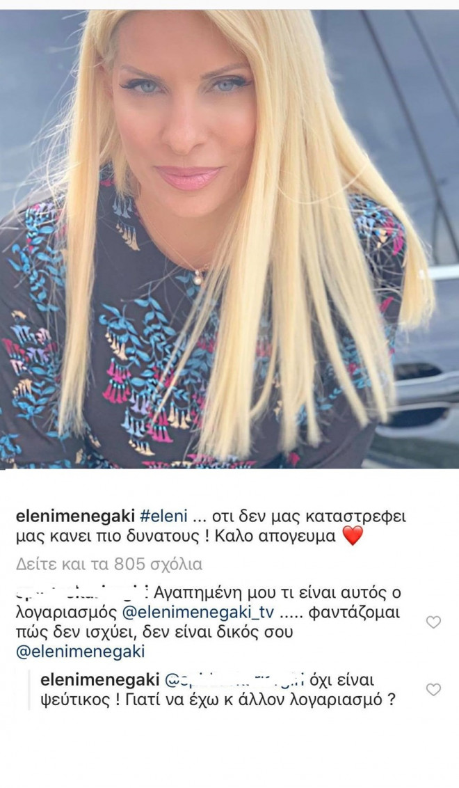 «Αγαπημένη μου τι είναι αυτός ο λογαριασμός; Φαντάζομαι πως δεν ισχύει, δεν είναι δικός σου» τη ρώτησε ένας χρήστης και με την παρουσιάστρια να απαντάει: «Όχι είναι ψεύτικος! Γιατί να έχω και άλλον λογαριασμό;».