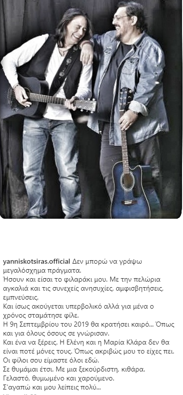 «Δεν μπορώ να γράψω μεγαλόσχημα πράγματα. Ήσουν και είσαι το φιλαράκι μου. Με την πελώρια αγκαλιά και τις συνεχείς ανησυχίες, αμφισβητήσεις, εμπνεύσεις. Και ίσως ακούγεται υπερβολικό αλλά για μένα ο χρόνος σταμάτησε φίλε. Η 9η Σεπτεμβρίου του 2019 θα κρατήσει καιρό... Όπως και για όλους όσους σε γνώρισαν. Και ένα να ξέρεις. Η Ελένη και η Μαρία Κλάρα δεν θα είναι ποτέ μόνες τους. Όπως ακριβώς μου το είχες πει. Οι φίλοι σου είμαστε όλοι εδώ. Σε θυμάμαι έτσι. Με μια ξεκούρδιστη, κιθάρα. Γελαστό, θυμωμένο και χαρούμενο. Σ' αγαπώ και μου λείπεις πολύ...», ήταν τα λόγια του.