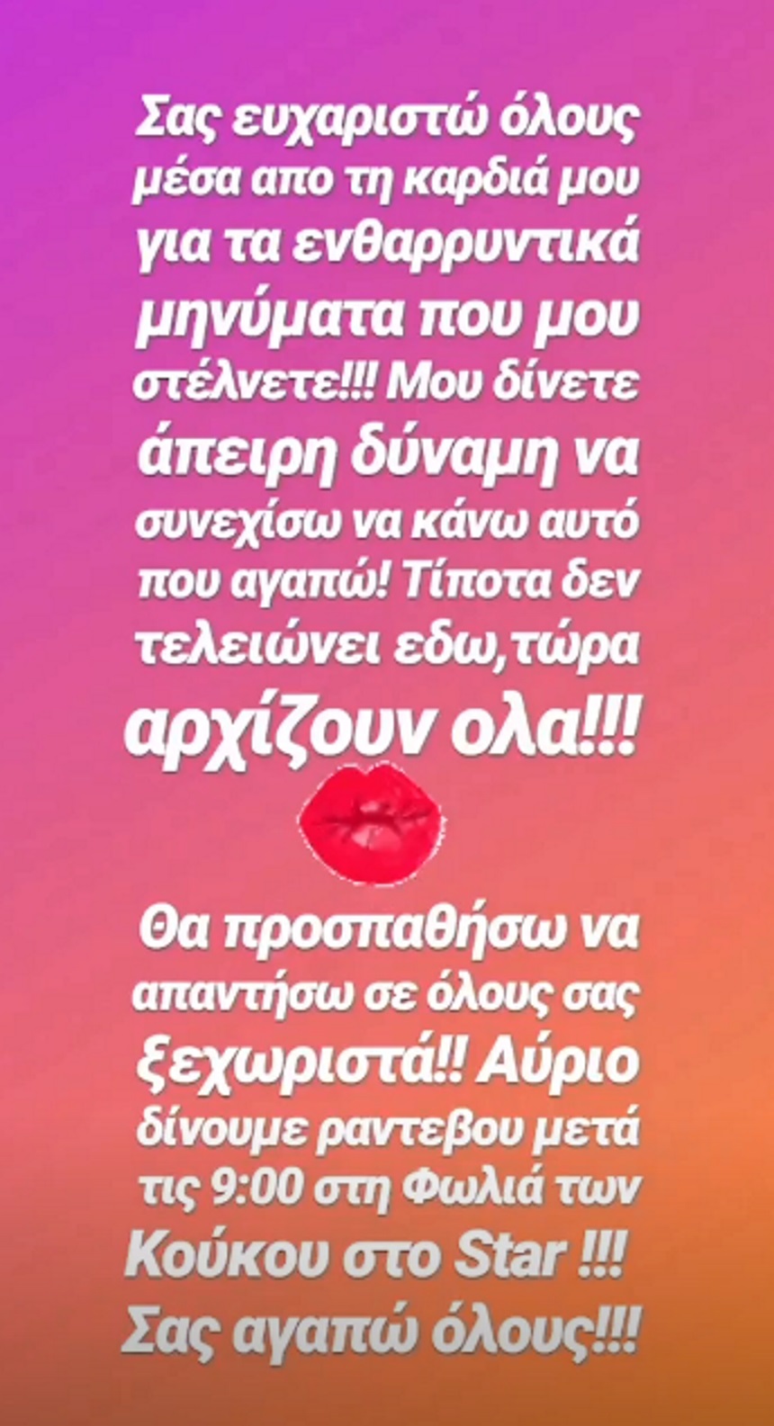 Η ίδια έκανε την πρώτη της ανάρτηση στο Instagram, γράφοντας: «Σας ευχαριστώ όλους μέσα από την καρδιά μου για τα ενθαρρυντικά μηνύματα που μου στέλνετε!!! Μου δίνετε άπειρη δύναμη να συνεχίσω να κάνω αυτό που αγαπώ! Τίποτα δεν τελειώνει εδώ, τώρα αρχίζουν όλα».