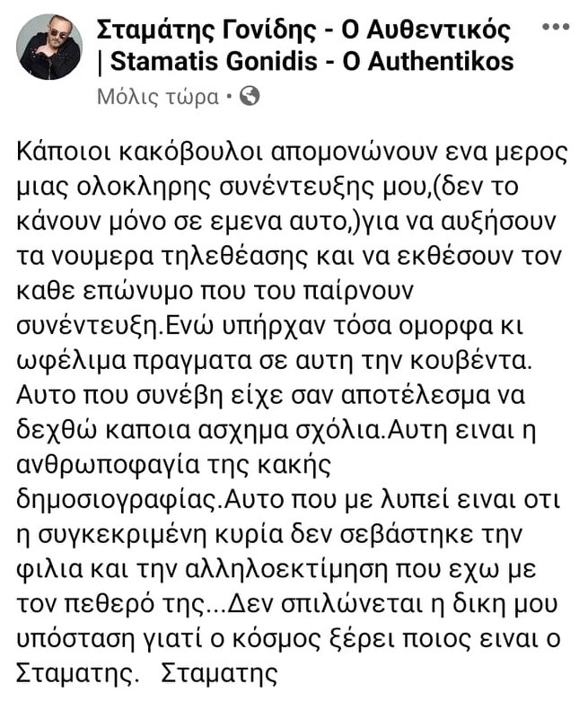 Μετά τα αρνητικά σχόλια που δέχτηκε ο ίδιος δίνει την απάντησή του μέσω ανάρτησης: «Κάποιοι κακόβουλοι απομονώνουν ένα μέρος μιας ολόκληρης συνέντευξης μου,(δεν το κάνουν μόνο σε εμένα αυτό,) για να αυξήσουν τα νούμερα τηλεθέασης και να εκθέσουν τον κάθε επώνυμο που του παίρνουν συνέντευξη. Ενώ υπήρχαν τόσα όμορφα κι ωφέλιμα πράγματα σε αυτή την κουβέντα. Αυτό που συνέβη είχε σαν αποτέλεσμα να δεχθώ κάποια άσχημα σχόλια. Αυτή είναι η ανθρωποφαγία της κακής δημοσιογραφίας. Αυτο που με λυπεί είναι ότι η συγκεκριμένη κυρία δεν σεβάστηκε την φιλία και την αλληλοεκτίμηση που έχω με τον πεθερό της...Δεν σπιλώνεται η δική μου υπόσταση γιατί ο κόσμος ξέρει ποιος είναι ο Σταμάτης».