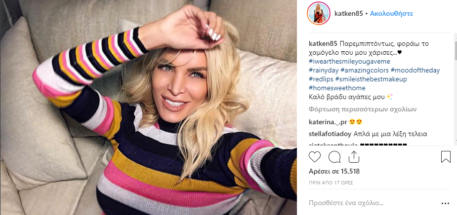 Η παρουσιάστρια δημοσίευσε μία φωτογραφία όπου ποζάρει χαμογελαστή και σχολίασε στη λεζαντα:«Παρεμπιπτόντως φοράω το χαμόγελο που μου χάρισες».