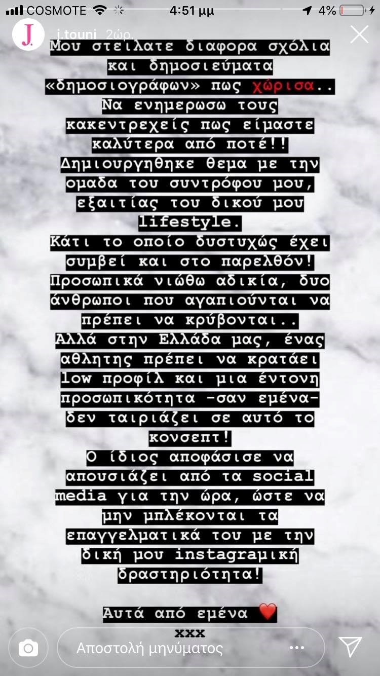 "Μου στείλατε διάφορα σχόλια και δημοσιεύματα δημοσιογράφων, που αναφέρουν πως χώρισα. Να ενημερώσω τους κακεντρεχείς, πως είμαστε καλύτερα από ποτέ. Δημιουργήθηκε θέμα με την ομάδα του συντρόφου μου, εξαιτίας του δικού μου lifestyle. Κάτι το οποίο δυστυχώς έχει συμβεί και στο παρελθόν. Προσωπικά νιώθω αδικία, δυο άνθρωποι που αγαπιούνται, να πρέπει να κρύβονται. Αλλά στην Ελλάδα μας, ένας αθλητής πρέπει να κρατάει low προφίλ και μια έντονη προσωπικότητα – σαν εμένα- δεν ταιριάζει σε αυτό το κόνσεπτ. Ο ίδιος αποφάσισε να απουσιάζει από τα social media, ώστε να μην εμπλέκονται τα επαγγελματικά του με τη δική μου instagraμική δραστηριότητα. Αυτά από εμένα.", έγραψε χαρακτηριστικά.
