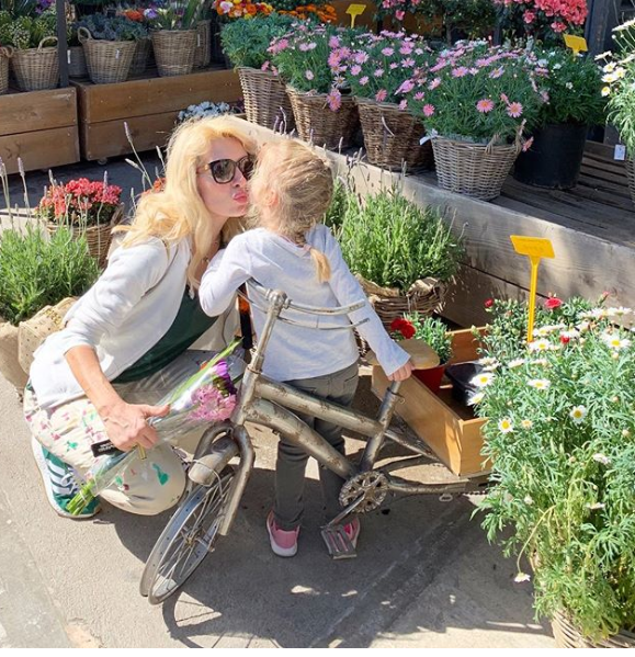 Έτσι μαμά και κόρη ανταλλάσσουν ένα γλυκό φιλί, ενώ περιβάλλονται από γλάστρες γεμάτες λουυλούδια.