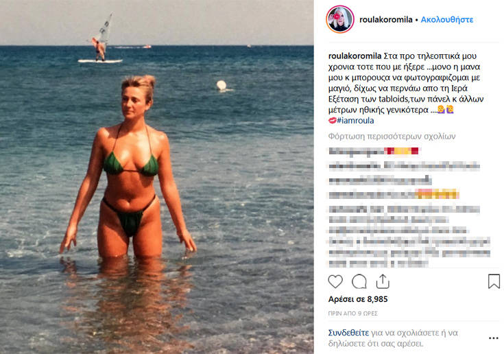 «Στα προ τηλεοπτικά μου χρόνια τότε που με ήξερε ...μόνο η μάνα μου κ μπορούσα να φωτογραφίζομαι με μαγιό, δίχως να περνάω από τη Ιερά Εξέταση των tabloids,των πάνελ κ άλλων μέτρων ηθικής γενικότερα», σχολίασε στη λεζάντα.