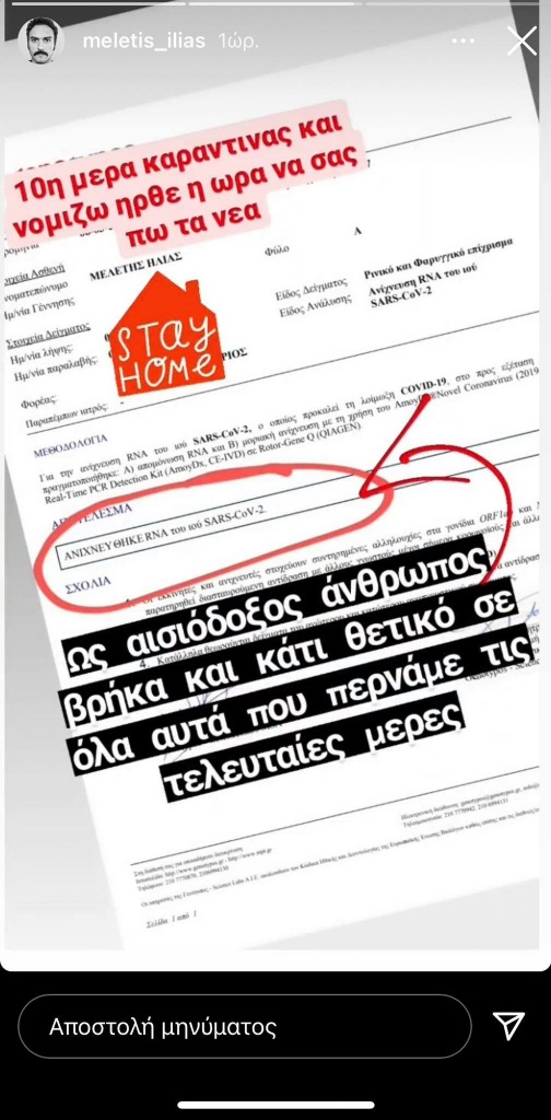 Ο Μελέτης Ηλίας με ανάρτησή του αποκάλυψε πως βρέθηκε θετικός στον κορωνοϊό και πως διανύει ήδη την δέκατη μέρα καραντίνας.
