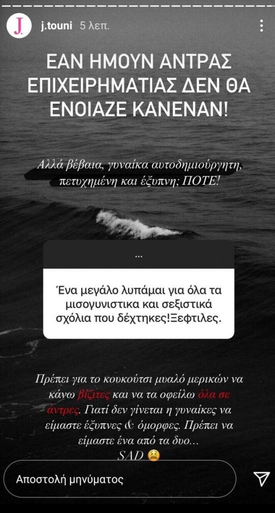 Το μοντέλο ξέσπασε με σχόλιο που της έκανε follower της και έγραψε χαρακτηριστικά: «Εάν ήμουν άντρας επιχειρηματίας δε θα ένοιαζε κανέναν. Αλλά βέβαια, γυναίκα αυτοδημιούργητη, πετυχημένη και έξυπνη; Ποτέ. Πρέπει για το κουκούτσι μερικών να κάνω βίζ@τες και να τα οφείλω όλα σε άντρες. Γιατί δε γίνεται οι γυναίκες να είμαστε έξυπνες και όμορφες. Πρέπει να είμαστε ένα από τα δύο… Sad».