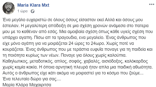 Μερικές ώρες μετά την κηδεία του Λαυρέντη Μαχαιρίτσα, η μοναχοκόρη του, Μαρία Κλάρα έγραψε ένα συγκινητικό μήνυμα στο Facebook