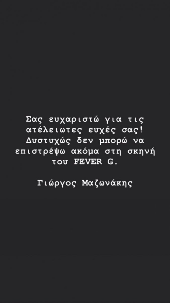 Ο τραγουδιστής θέλησε να ευχαριστήσει τον κόσμο για το ενδιαφέρον, σχολιάζοντας: «Σας ευχαριστώ για τις ατέλειωτες ευχές σας. Δυστυχώς δε μπορώ να επιστρέψω ακόμη στη σκηνή του Fever G».
