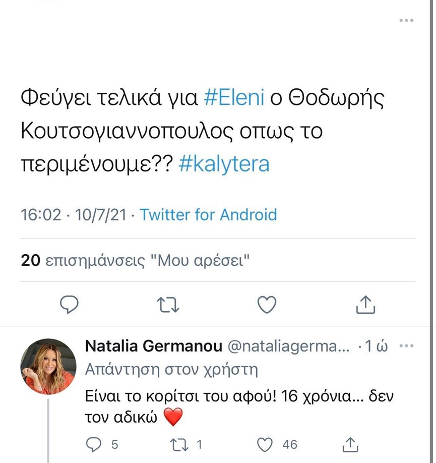 Την απάντηση, έδωσε η Ναταλία Γερμανού αφού σε ερώτηση που δέχτηκε από ακόλουθό της στο twitter απάντησε: “Είναι το κορίτσι του αφού! 16 χρόνια…δεν τον αδικώ”.