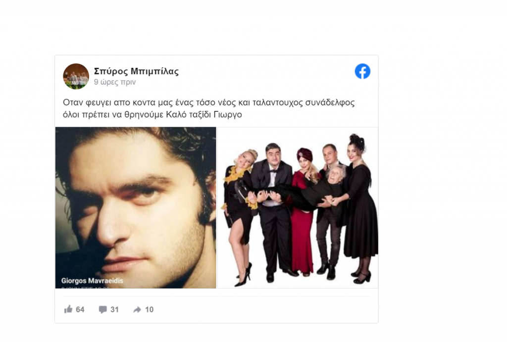 Τη δυσάρεστη είδηση αποκάλυψε με ανάρτησή του ο Σπύρος Μπιμπίλας: «Όταν φεύγει από κοντά μας ένας τόσο νέος και ταλαντούχος συνάδελφος, όλοι πρέπει να θρηνούμε. Καλό ταξίδι Γιώργο» έγραψε χαρακτηρισιτκά.