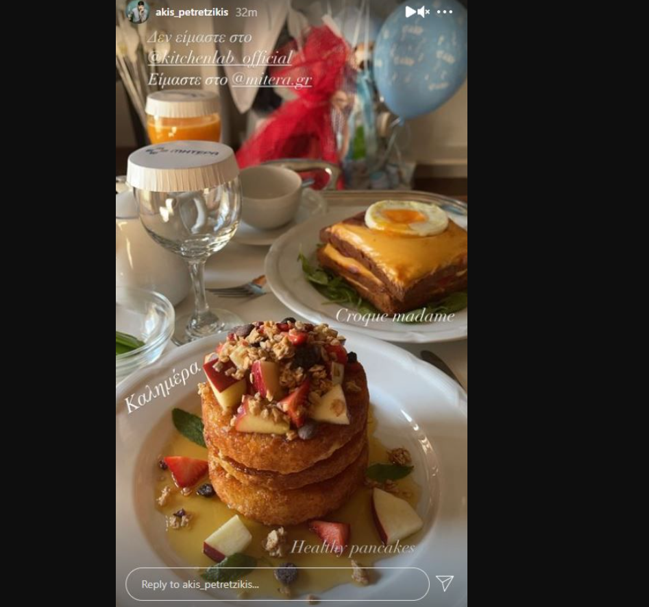 Για πρώτη φορά έγινε πατέρας ο Άκης Πετρετζίκης και πλέει σε πελάγη ευτυχίας. Ο Άκης Πετρετζίκης δημοσίευσε μέσω InstaStory φωτογραφία από το πρωινό που απόλαυσαν μαζί με τη σύντροφό του στο μαιευτήριο.