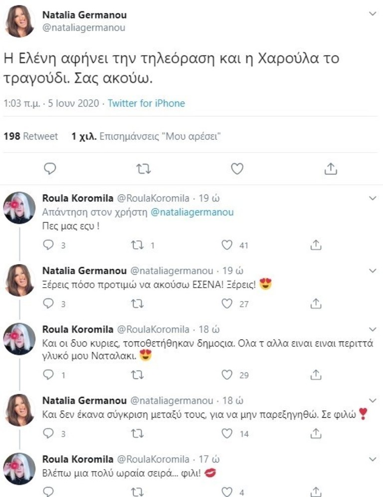 Η Ρούλα Κορομήλα μέσα από έναν διάλογο που είχε στο Twitter με τη Ναταλία Γερμανού, πήρε θέση για πρώτη φορά.