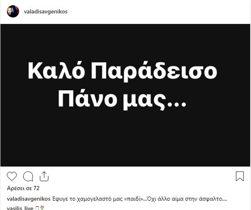 «Έφυγε το χαμογελαστό μας «παιδί»...Όχι άλλο αίμα στην άσφαλτο....Καλό παράδεισο Πάνο μας», έγραψε ο τραγουδιστής στα social media.