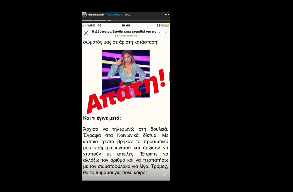 Η Δέσποινα Βανδή έπεσε θύμα διαδικτυακής απάτης, όπως έχει συμβεί και σε πολλά άλλα πρόσωπα της ελληνικής showbiz.
