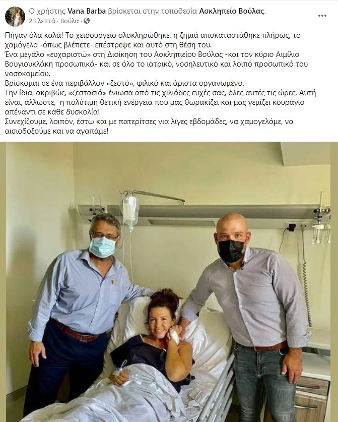 H Bάνα Μπάρμπα νοσηλεύεται στο νοσοκομείο. Μάλιστα, η Βάνα Μπάρμπα δημοσίευσε μια φωτογραφία μέσα από το νοσοκομείο και ενημέρωσε τους διαδικτυακούς της φίλους πως όλα πήγαν καλά.