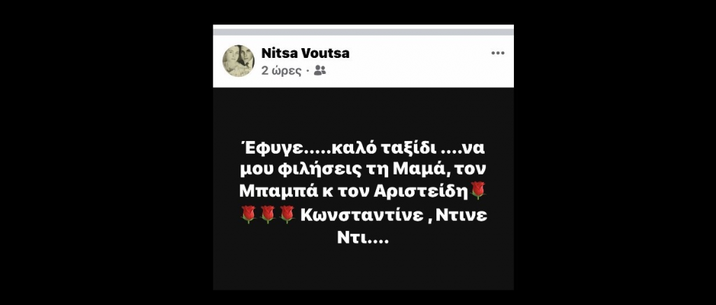 «Έφυγε... καλό ταξίδι... Να μου φιλήσεις τη μαμά, τον μπαμπά και τον Αριστείδη... Κωνσταντίνε, Ντίνε, Ντι...»., έγραψε η ίδια.