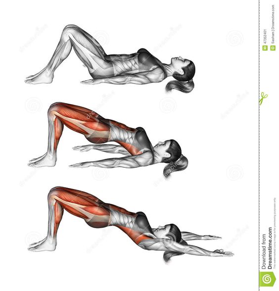 Αφήστε τα χέρια σας κατά μήκος των πλευρών σας, συμπιέστε τους μύες των άκρων σας για να σηκώσετε τους γοφούς σας και να τους πιέσετε ξανά στην κορυφή, στη συνέχεια χαμηλώστε αργά τα ισχία σας προς τα κάτω.
