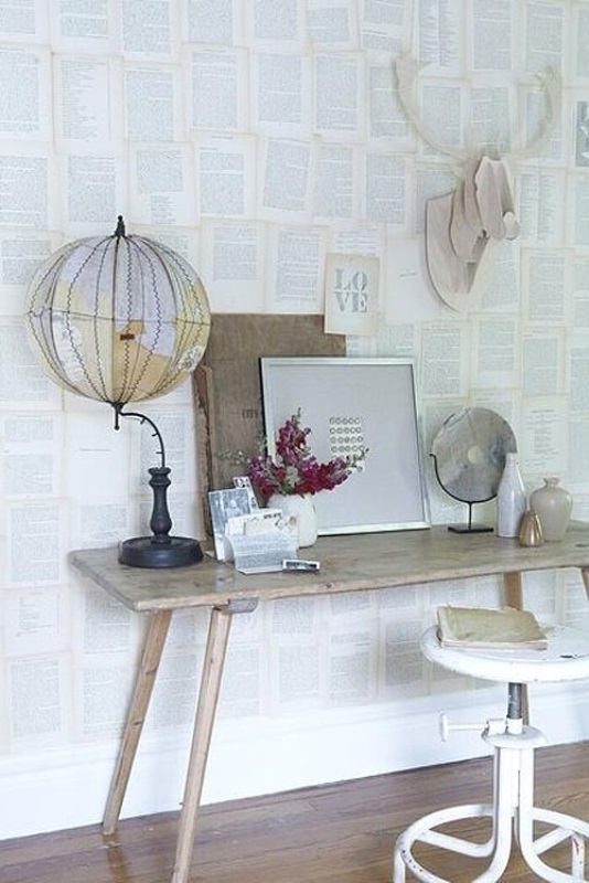 - Μπορούμε εύκολα να δημιουργήσουμε μια ταπετσαρία για τους τοίχους μας, χρησιμοποιώντας τις σελίδες του βιβλίου ή και ολόκληρα βιβλία, σε περιορισμένο χώρο. Πρώτα απ’ όλα, παίρνουμε τα μέτρα του τοίχου μας και τις διαστάσεις των σελίδων, για να έχουμε ένα πλάνο πως θα τοποθετηθούν. Είτε κόβουμε τις σελίδες από τα βιβλία και τις κολλάμε στον τοίχο με ειδική κόλλα, την οποία απλώνουμε με βούρτσα, είτε κολλάμε τα ίδια τα βιβλία στον τοίχο, με το εξώφυλλο κολλημένο στον τοίχο. Αν χρησιμοποιήσουμε βιβλία, πρέπει να έχουμε υπόψη μας ότι οι σελίδες εσωτερικά πρέπει να είναι κολλημένες μεταξύ τους. Ξεκινάμε να κολλάμε από πάνω προς τα κάτω. Στα σημεία όπου έχουμε εμπόδια, όπως πρίζες και διακόπτες, κόβουμε περιμετρικά το χαρτί με νυστέρι, για τέλεια εφαρμογή. Στο τέλος, μπορούμε να περάσουμε από πάνω μια ειδική κόλλα, που θα προστατέψει την ταπετσαρία μας και θα την «πλαστικοποιήσει».