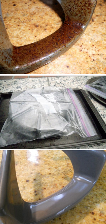 - Καθαρίστε τη σκουριά με αμμωνία. Πάρτε 1/4 φλιτζάνι αμμωνία και σφραγίστε την επιφάνεια που θέλετε να καθαρίσετε με μία πλαστική σακούλα. Αφήστε το να καθίσει για μία νύχτα και στη συνέχεια καθαρίστε το με ένα καθαρό σφουγγάρι.