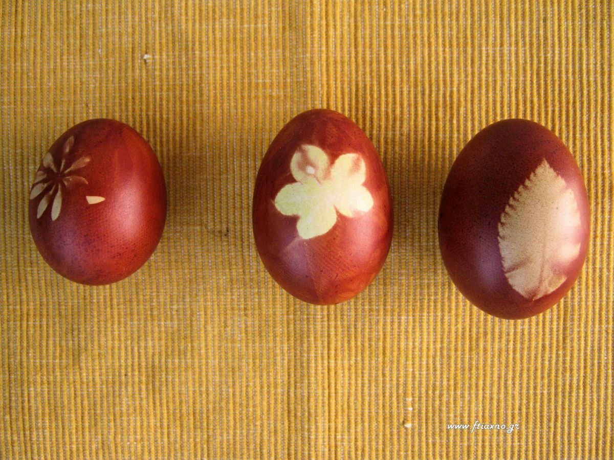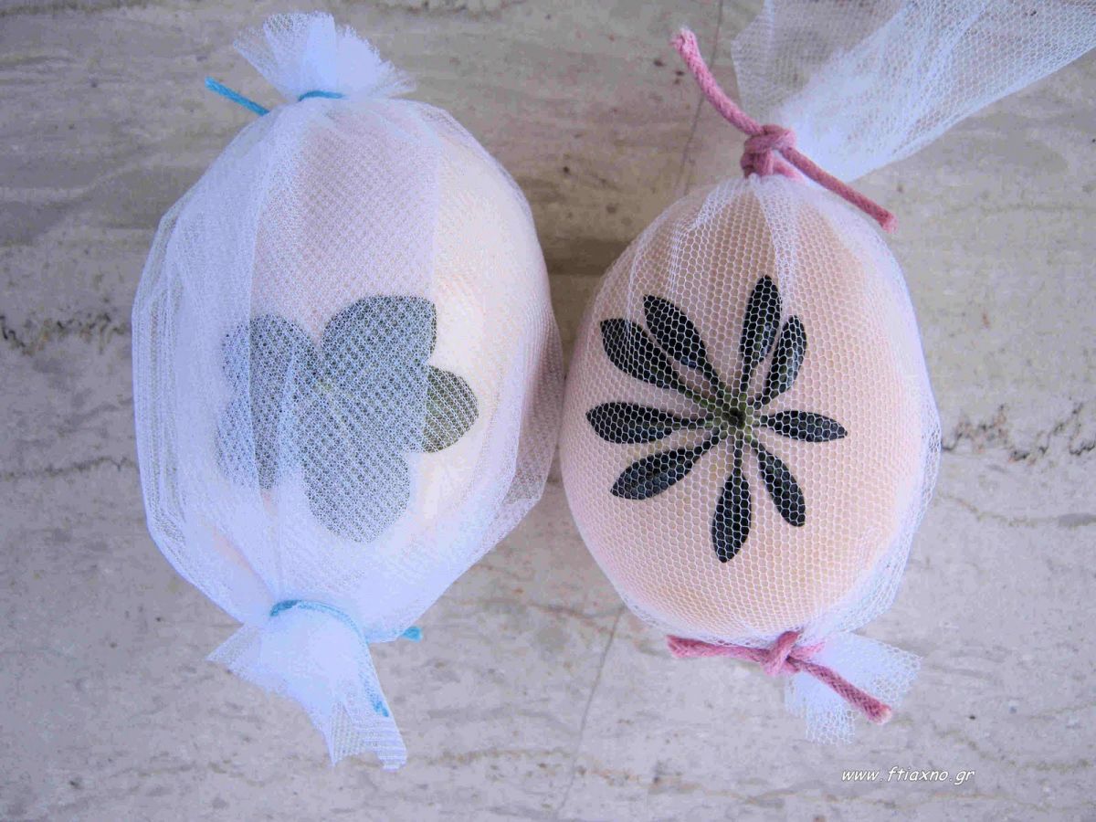 - Φυσικά και μπορούμε να κάνουμε και σχέδια στα αυγά μας με διάφορα φυλλαράκια αρκεί να είναι πλατιά, τυλίγοντάς τα με τούλι ή καλτσόν.