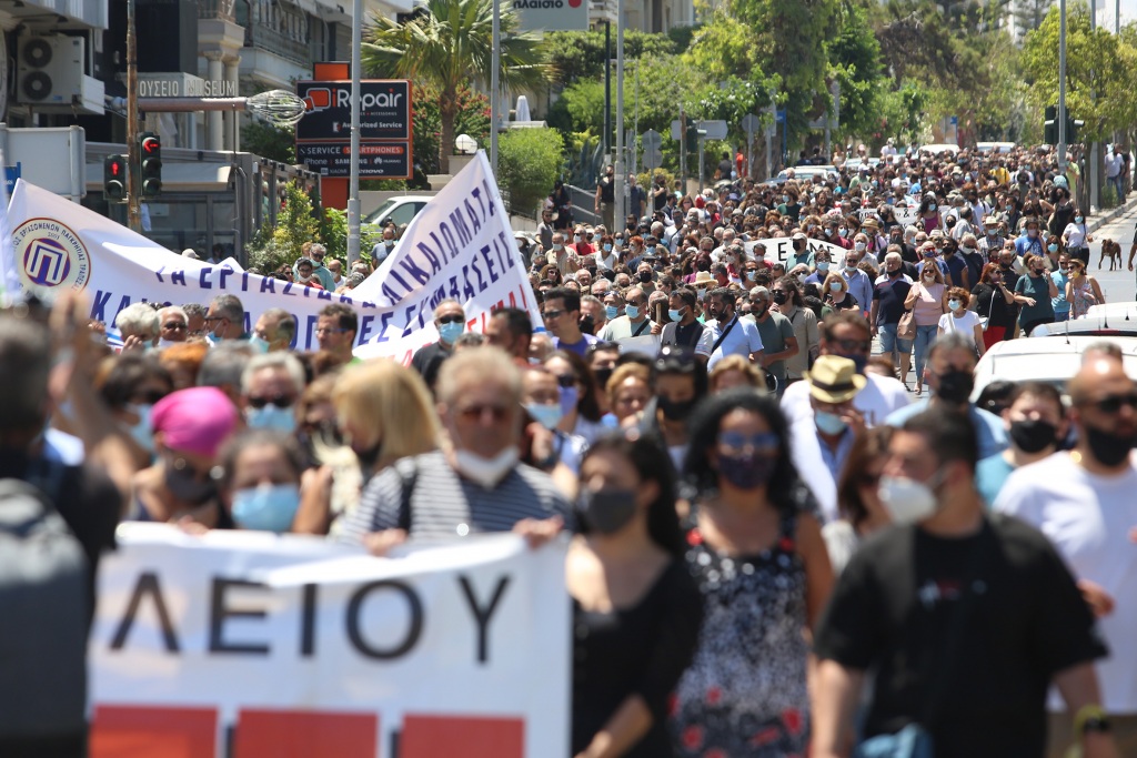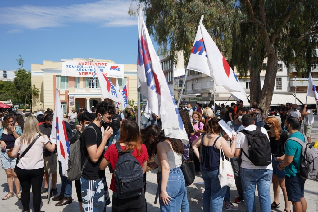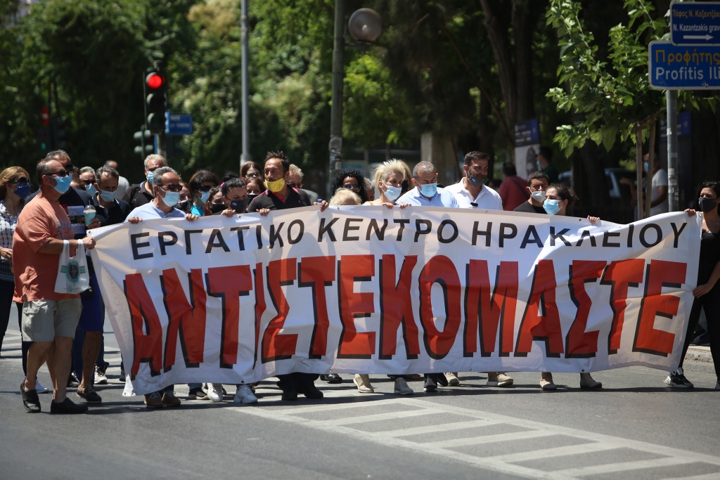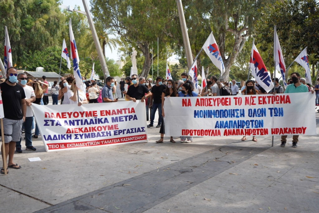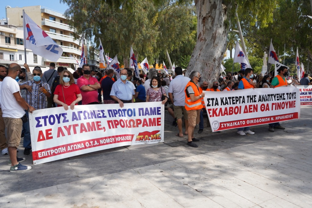 Στο Ηράκλειο, συγκεντρώσεις πραγματοποιήθηκαν έξω από το Εργατικό Κέντρο και την πλατεία Ελευθερίας (από το ΠΑΜΕ).
