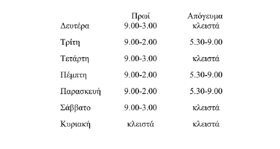 Ο Εμπορικός Σύλλογος Ηρακλείου ενημερώνει τα μέλη του ότι το θερινό ωράριο των εμπορικών καταστημάτων που θα ισχύει από Πέμπτη 3-6-2021 είναι το ακόλουθο: