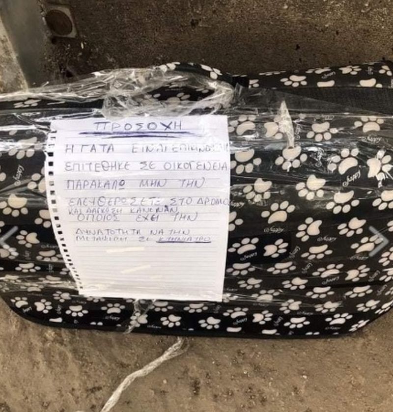 Κάτοικοι της Ακαδημίας Πλάτωνος εντόπισαν στην οδό Φαίδωνος 57, ένα γατάκι παρατημένο μέσα βαλιτσάκι μεταφοράς που είχαν τυλίξει με σελοτέιπ και είχαν αφήσει το εξής μήνυμα: