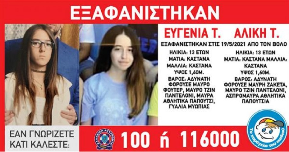 Συγκεκριμένα, στις 19 Μαΐου 2021 μεσημεριανές ώρες, εξαφανίστηκαν από το σπίτι τους στην περιοχή του Βόλου, οι ανήλικες Ευγενία Τ., 13 ετών, και Αλίκη Τ., 13 ετών.