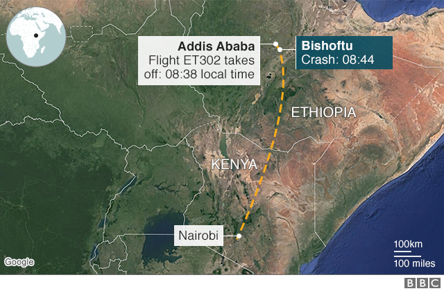 Εκπρόσωπος της Ethiopian Airlines ανέφερε ότι ο αερομεταφορέας της χώρας έχασε την επαφή με το αεροσκάφος έξι λεπτά μετά την απογείωσή του από το διεθνές αεροδρόμιο Bole προτού συντριβεί κοντά στην πόλη Μπισοφτου, 62 χλμ. νοτιοανατολικά της πρωτεύουσας Αντίς Αμπέμπα.