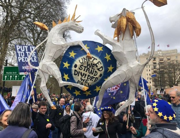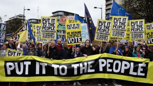 Ένα εκατομμύριο άνθρωποι που αντιτίθενται στην αποχώρηση της Βρετανίας από την Ευρωπαϊκή Ένωση, έκαναν σήμερα πορεία στο κέντρο του Λονδίνου ζητώντας να διεξαχθεί νέο δημοψήφισμα, καθώς η κρίση του Brexit βαθαίνει και απειλεί την πρωθυπουργία της Τερέζα Μέι.