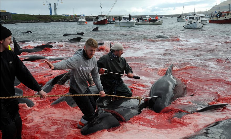 «Κόκκινη» έγινε για άλλη μια φορά η θάλασσα στα νησιά Φεροέ με τους κατοίκους ενός απομακρυσμένου χωριού να σφάζουν σχεδόν 250 φάλαινες και δελφίνια ενώ αυτά μετακινούταν βορειότερα.