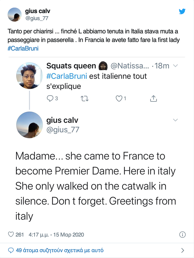 Την ώρα που ο πλανήτης δοκιμάζεται από τον φονικό ιό, και οι δυο χώρες της, Ιταλία και Γαλλία θρηνούν χιλιάδες ανθρώπους θύματα του φονικού ιού η πρώην πρώτη κυρία εμφανίζεται σε βίντεο να κοροϊδεύει τον κορωνοϊό βήχοντας και δηλώνοντας: "Ανήκουμε στην παλιότερη γενιά, δεν φοβόμαστε τίποτα. Δεν είμαστε φεμινίστριες, δεν φοβόμαστε τον κορωνοϊό".