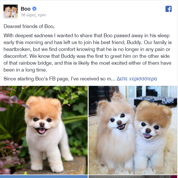 Ο Buddy, το άλλο σκυλί της οικογένειας, πέθανε το 2017 και από τότε ο Boo είχε αρχίσει να δείχνει τα πρώτα σημάδια της κατάπτωσής του που συνεχίστηκε και επιδείνωσε την υγεία του. «Πιστεύουμε πως η καρδιά του ράγισε όταν ο Buddy μας άφησε», έγραψαν στη σελίδα του Boo στο Facebook οι ιδιοκτήτες του.