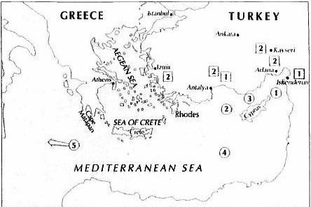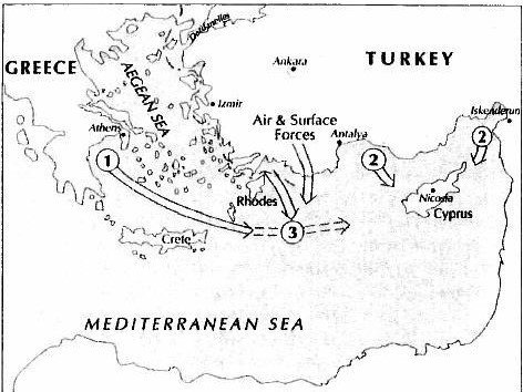 Στον πρώτο χάρτη, σύμφωνα πάντα με το σενάριο, η Ελλάδα αποφασίζει να εγκαταστήσει τακτικούς βαλλιστικούς πυραύλους στην Κυπριακή Δημοκρατία. Η Τουρκία, για να αποτρέψει αυτή την κίνηση, προειδοποιεί με σκληρό τρόπο την Αθήνα, η οποία ωστόσο δεν κάνει πίσω και πλοία της κατευθύνονται προς την Κύπρο, αλλά βυθίζονται από το τουρκικό ναυτικό.