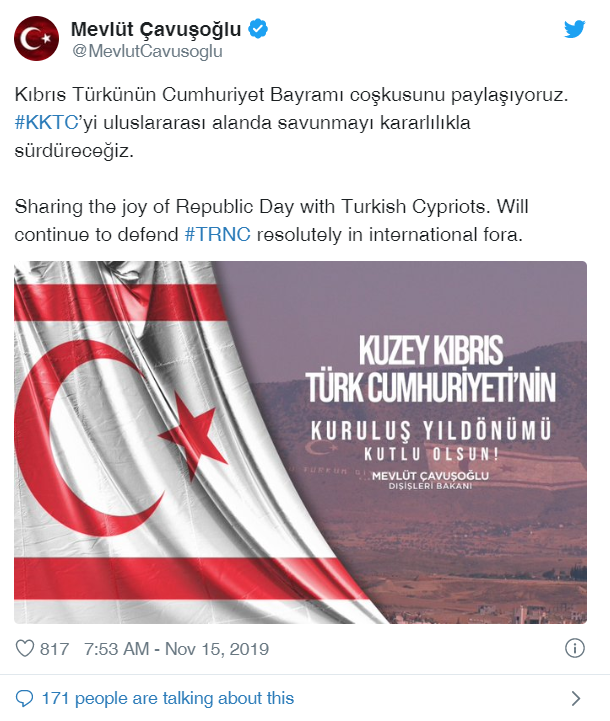 Σε ανάρτησή του στο Twitter ο υπουργός Εξωτερικών Μεβλούτ Τσαβούσογλου αναφέρει, ότι η Τουρκία συμμερίζεται τον ενθουσιασμό για την ημέρα της «τουρκοκυπριακής δημοκρατίας», όπως ονομάζει το ψευδοκράτος.