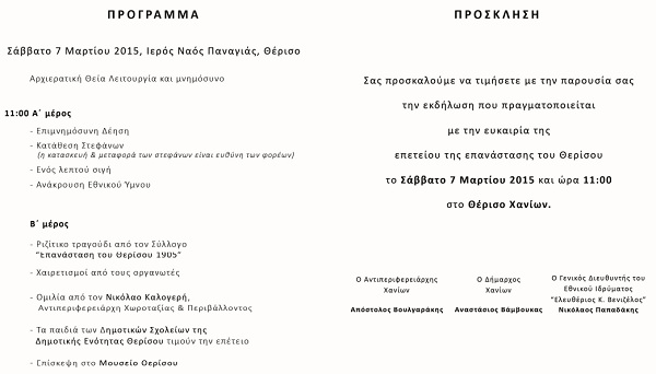 Εκδήλωση για την επέτειο της επανάστασης του Θερίσου θα πραγματοποιηθεί το Σάββατο 7 Μαρτίου 2015 στις 11:00 στο Θέρισο Χανίων. Στον Ι.Ν. Παναγίας Θερίσου θα γίνει Αρχιερατική Θεία Λειτουργία και μνημόσυνο ενώ στη συνέχεια θα ακολουθήσει εκδήλωση με ριζίτικα τραγούδια, ομιλία από τον Αντιπεριφερειάρχη Χωροταξίας και Περιβάλλοντος, Νικόλαο Καλογερή καθώς και επίσκεψη στο μουσείο Θερίσου.