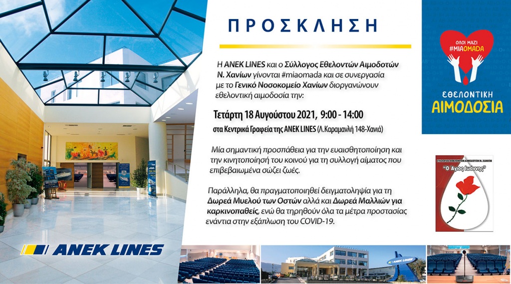 Εθελοντική Αιμοδοσία, όπως και δειγματοληψία για τη Δωρεά Μυελού των Οστών, διοργανώνει, την τετάρτη 18/8, η ΑΝΕΚ LINES με τον Σύλλογο Εθελοντών Αιμοδοτών Ν. Χανίων "Ο Άγιος Ιωάννης" και το Γεν. Νοσοκομείο Χανίων.