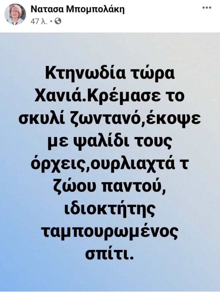 Σύμφωνα με την πρόεδρο της Πανελλαδικής Φιλοζωικής Περιβαλλοντικής Ομοσπονδίας Νατάσα Μπομπολάκη, στην περιοχή του Ακρωτηρίου, ένας άνδρας κρέμασε σκύλο ζωντανό και του έκοψε τους όρχεις με ψαλίδι.