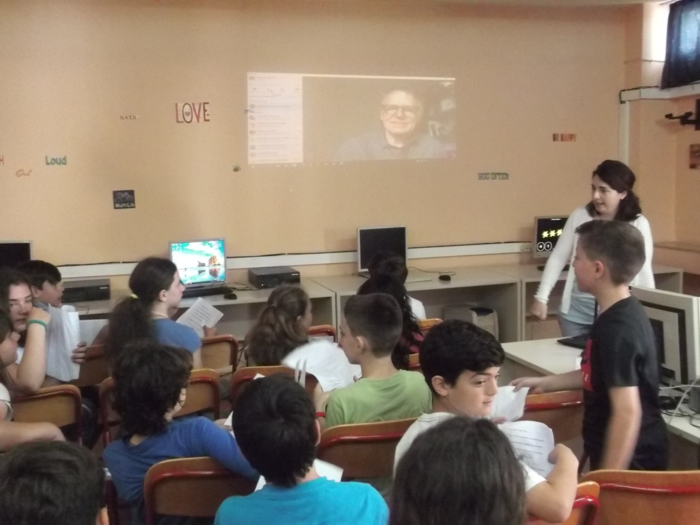 Ο κύριος μας, κ. Βαγγέλης, δεν άφησε την ευκαιρία να περάσει και μας υποσχέθηκε ότι θα προσπαθήσει να έρθει σε επικοινωνία με τον συγγραφέα του διάσημου σε ολόκληρο τον κόσμο παιδικού ήρωα, Jurgen Banscherus (Γίργκεν Μπανσέρους). Έτσι λοιπόν μετά από λίγες ημέρες κι αφού του κάναμε σαν τάξη (Στ΄ 1 του 8ου Δημοτικού Σχολείου Χανίων) αίτημα επικοινωνίας στα γερμανικά- τα μαθαίνουμε σαν δεύτερη ξένη γλώσσα εδώ και δυο χρόνια-με χαρά κι έκπληξη λάβαμε απάντηση και κανονίστηκε η ημέρα και η ώρα. Μέσω τηλεπικοινωνίας (Skype) από τα ηλιόλουστα Χανιά, τα εκτάκια του Στ΄1 , του 8ου Δημοτικού Σχολείου Χανίων ήρθαμε σε επικοινωνία με τον διάσημο αλλά παράλληλα απλό συγγραφέα του Ντετέκτιβ που μένει κοντά στο βροχερό αυτή την εποχή Ντόρτμουντ.