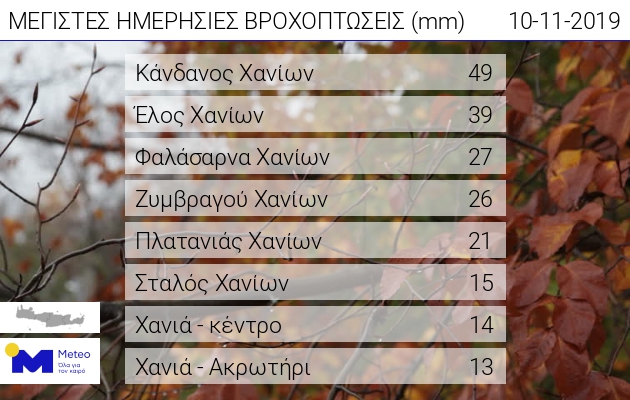 Σημαντικά ύψη βροχής είχαμε την Κυριακή 10 Νοεμβρίου σε περιοχές της Δυτικής Κρήτης, σύμφωνα με το ενημερωτικό δελτίο από τον κ. Κ. Λαγουβάρδο.