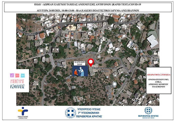 Έλεγχοι ταχείας ανίχνευσης αντιγόνου Covid-19 (rapid test) σε πεζούς θα πραγματοποιηθούν τη Δευτέρα 24/05/2021 από κλιμάκια του ΕΟΔΥ στην Άνω Βιάννο.